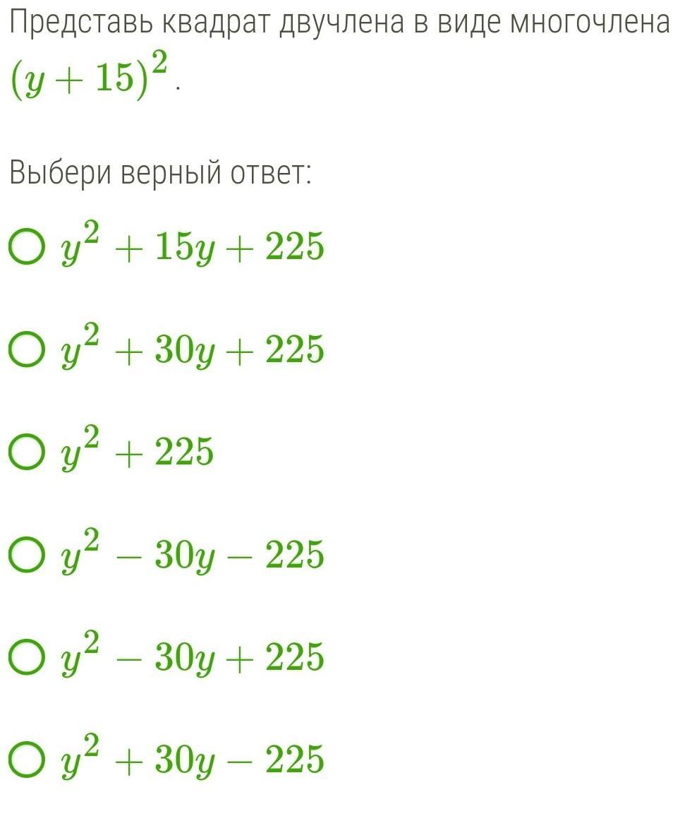 Объяснение ответ номер 3 y в квадрате+225. 225 это квадрат 15 а квадрат у следовательно У в квадрате если вынестито получиться то что нужно