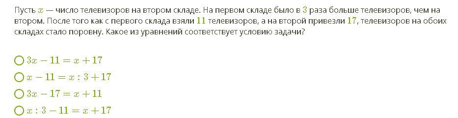 Деления в условии вообще нет, значит отметаем варианты с деление, дальше х это первый склад, а на первый привезли 17