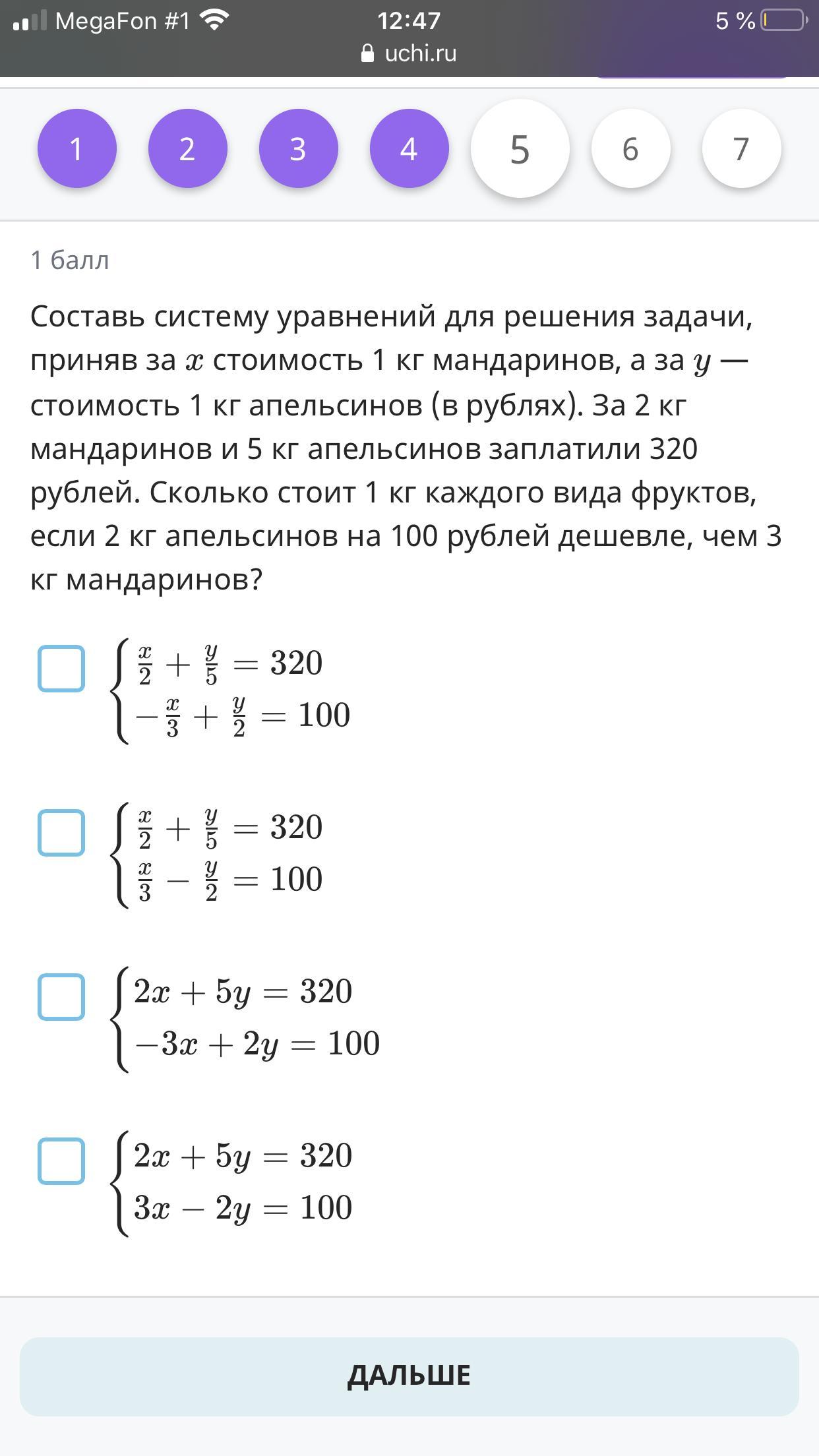 2x+5y=320 - это сумма стоимостей 2 кг мандаринов и 5 кг апельсинов