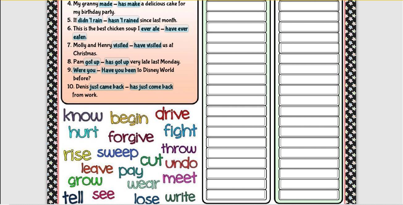PAST SIMPLE: knew, began, drove, hurt, forgave, fought, rose, swept, cut, threw, left, paid, undid, grew, wore, met, told, saw, lost, wrote.