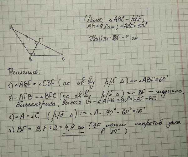 В треугольнике АВС известно, что АВ = ВС = 9,8 см, угол АВС равен 120°. Найти расстояние от вершины В до прямой АС.