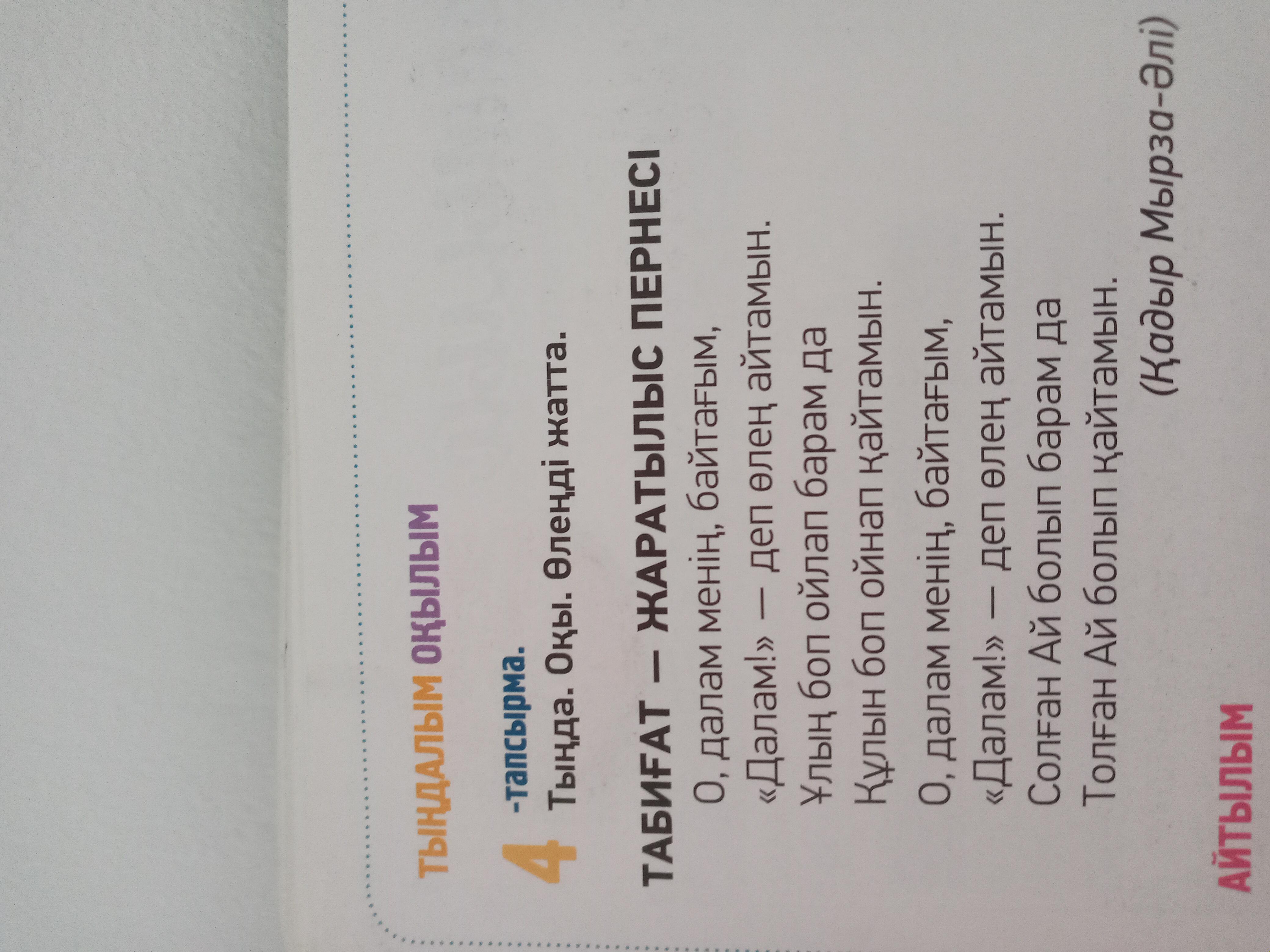 Өлеңде қай сөз жиі қайталанады? Бұл өлең не туралы? «Мен даланың ұлымын» деген мағына беретін жолды тауып оқыңдар. Неге автор «даланың ұлымын» деп айтады? Табиғатта демалған адамның көңіл-күйі қандай болады?