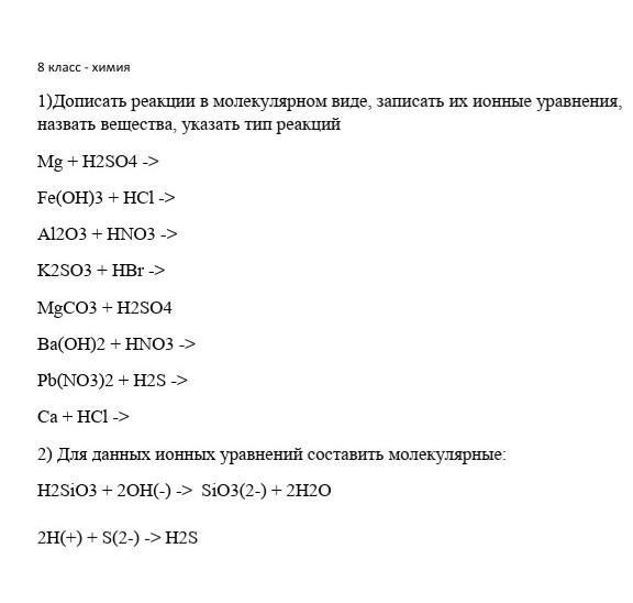 1. 1) мол.вид. Mg + H2SO4 = MgSO4 + H2↑(бесцвет.газ, хорошо горит); ( магний + серная кислота = сульфат магния + водород )