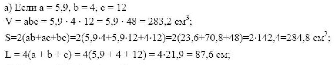 Длина прямоугольного параллелепипеда равна "а" см, ширина "б" см и высота "с" см. Найдите объем, площадь поверхности и сумму длин всех ребер этого параллелепида, если: