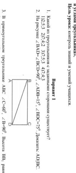 2. Т.к. CD можно рассматривать как секущую к прямым BC и AD, то доказательство параллельности AD и BC сводится к нахождению каких-нибудь особых пар углов, которые при параллельности прямых дают определенное значение. Например, можно сказать, что т.к. угол ADC = 15° + 75° = 90°, а угол BCD равен также 90°, то сумма BCD и ADC равна 180. Эта пара углов называется внутренние односторонние. Доказывается, что если их сумма равна 180° (как в нашем случае), то прямые, которые пересекаются секущей, параллельны. То есть AD║BC.