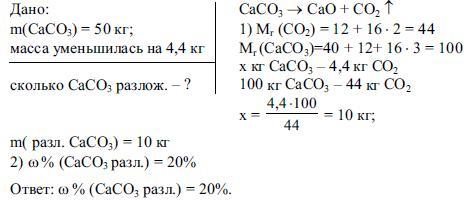При прокаливании 50 кг яистого карбона кальции его масса уменьшилась при 4,4 кг Сколько процентов карбоната кальция разложилось?