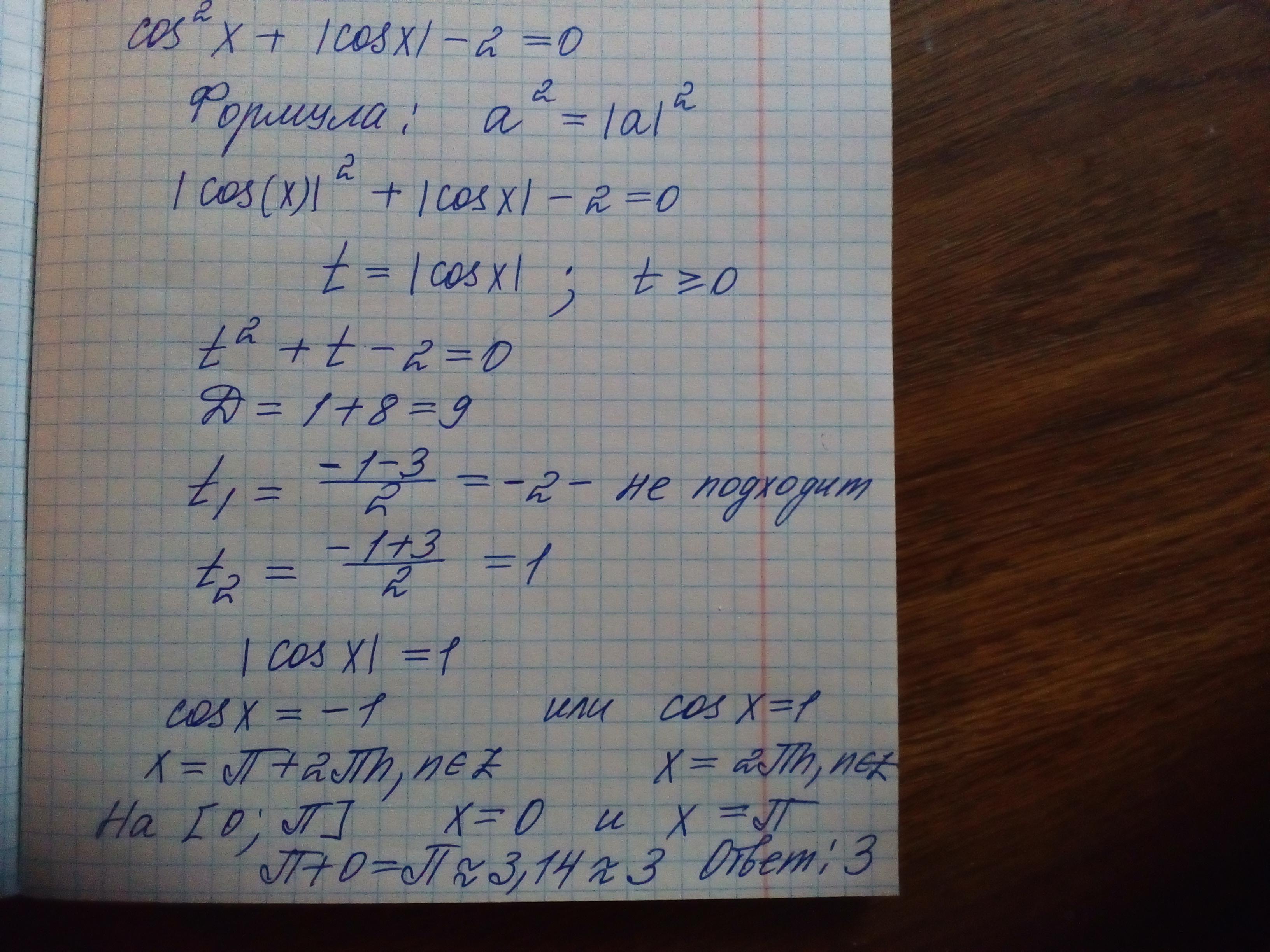 Найдите сумму корней уравнения cos^2x + |cosx| - 2 = 0 на промежутке [0;π]. Число π округлите до целых.