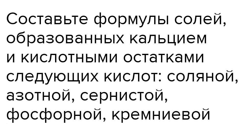 Ответ: CaCl2, Ca(No3)2, CaSO3, Ca3(Po4)2, CaSio3