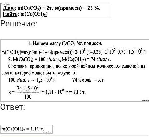 Какова масса гашенной извести СаО, полученной из известняка СаСО3 массой 5 т, содержащего 15% примесей.