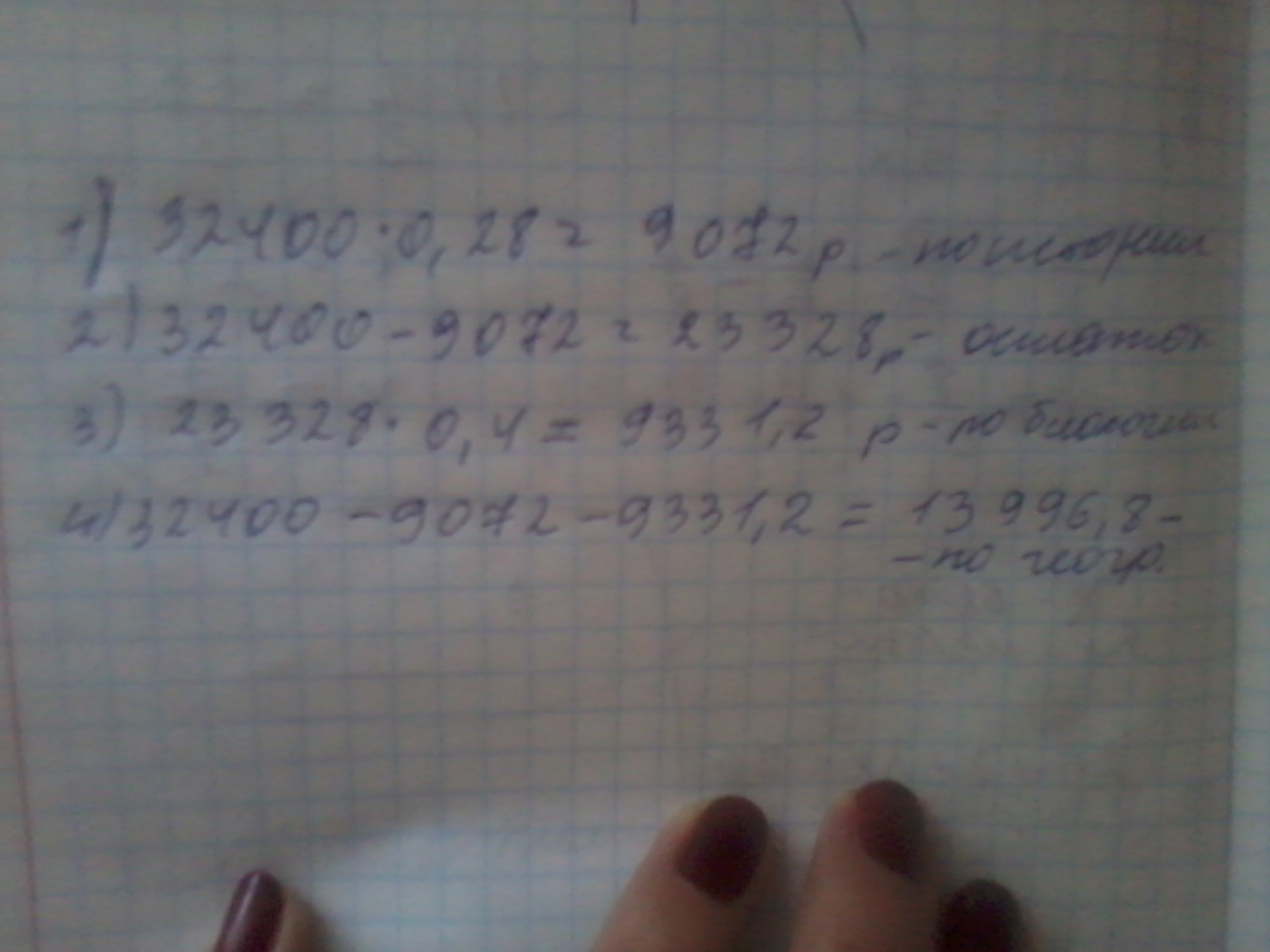 На приобретение учебника по истории биологии и географии школа затратила 32400руб.За учебник по истории заплатили 28% этой суммы а за учебник по биологии 40% остатка.Определити стоимость учебников по географии.