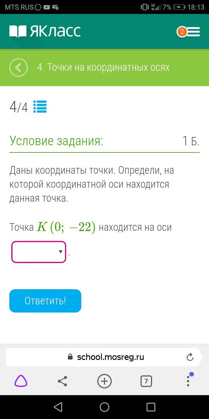 Ответ: точка находится на оси oy или же просто y, смотря какие варианты ответов