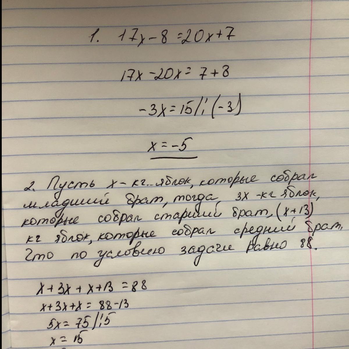 2. Три брата собрали 88 кг яблок. Старший собрал в 3 раза больше, чем младший, а средний – на 13 кг больше, чем младший. Сколько килограммов яблок собрал младший брат?