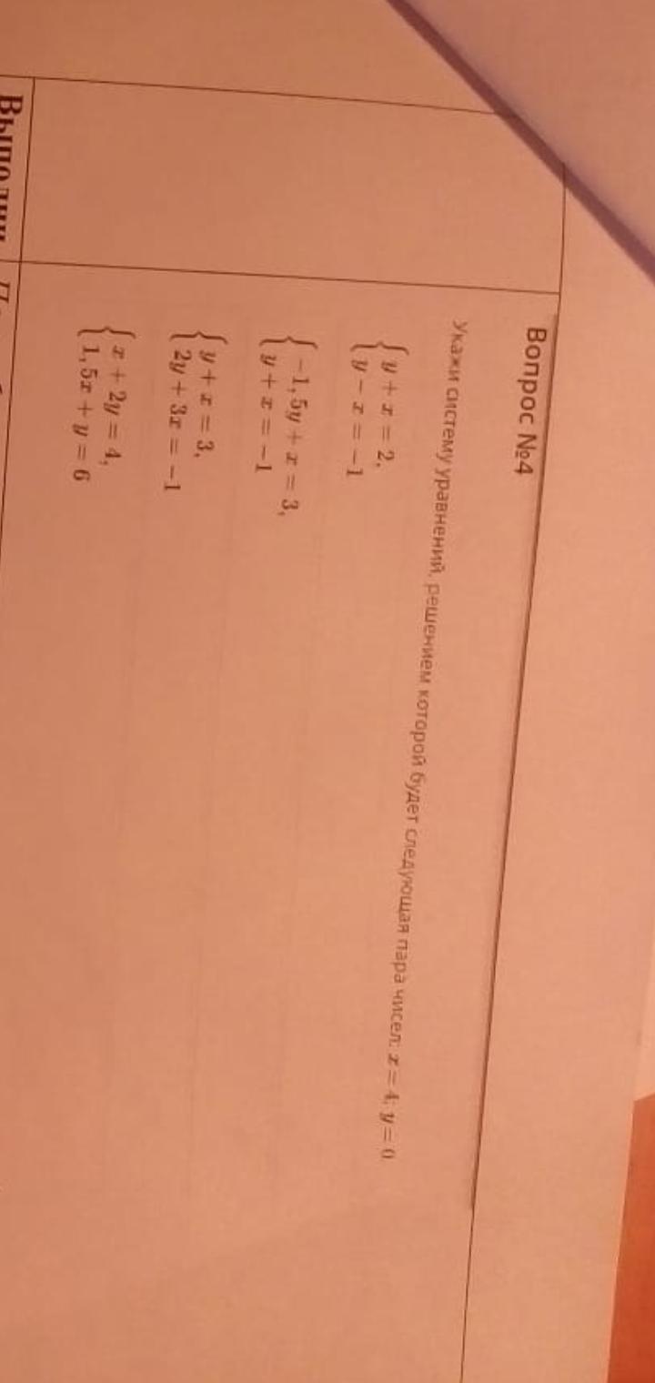 Укажите систему уравнений, решением который будет следующая пара чисел х=4;у=0 Помогите