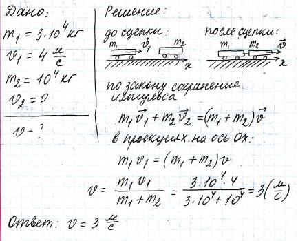 Вагон масою 30 т рухається зі швидкістю 4 м/с і стикається з нерухомою платформою масою 10 т. Визначте швидкість вагона і платформи після того, як спрацює автозчеплення.