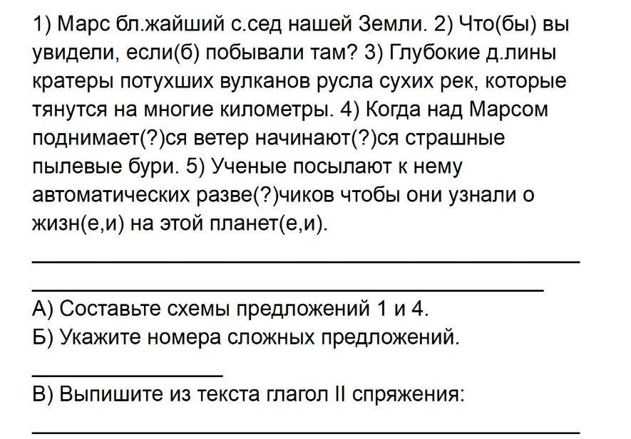 1) Марс ближайший сосед нашей Земли. 2) Что бы вы увидели, если б побывали там? 3) Глубокие долины кратеры потухших вулканов русла сухих рек, которые тянутся на многие километры. 4) Когда над Марсом поднимается ветер начинаются страшные пылевые бури. 5) Учёные посылают к нему автоматических разведчиков чтобы они узнали о жизни на этой планете.