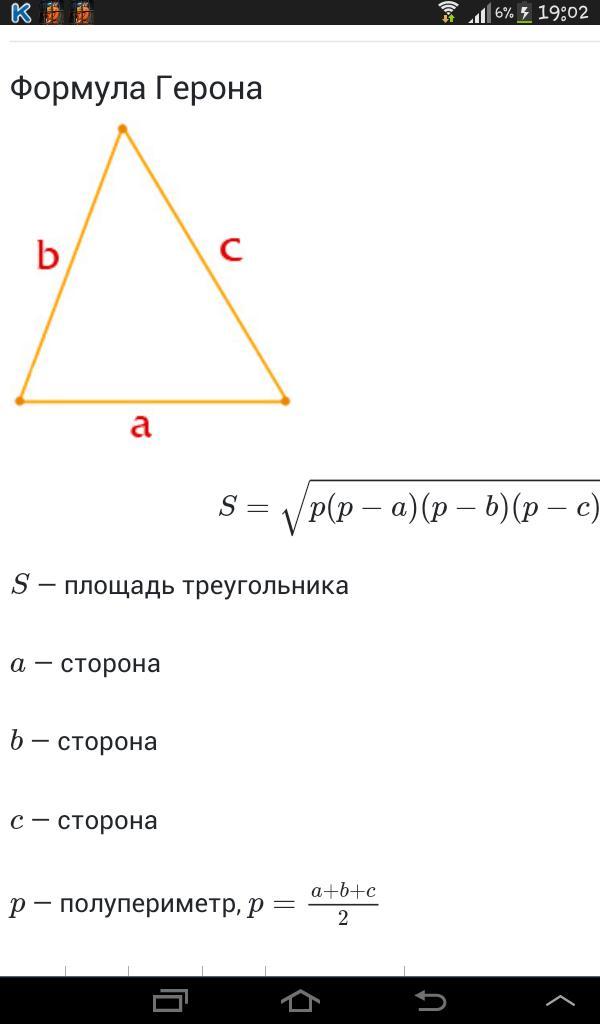 Формула Герона, позволяет вычислить площадь треугольника, зная длины его сторон.