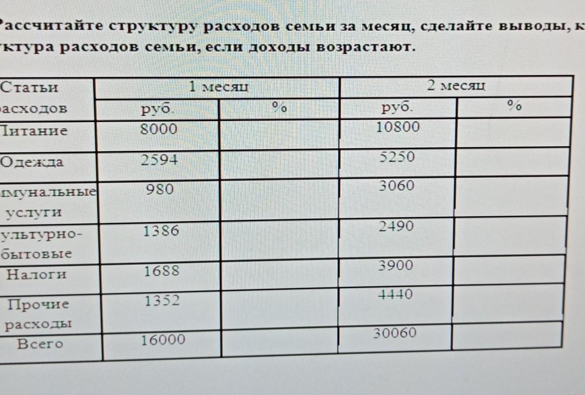 ✓ Также обрати внимание на строку „Всего”. Если разделить второе на первое, то узнаем рост расходов (во сколько раз). Попробуй сравнить рост доходов с ростом расходов. У семьи, которая живёт по средствам, эти числа не должны отличаться существенно. Хотя и совпадение этих чисел (в условиях реального ценообразования) тоже маловероятно.