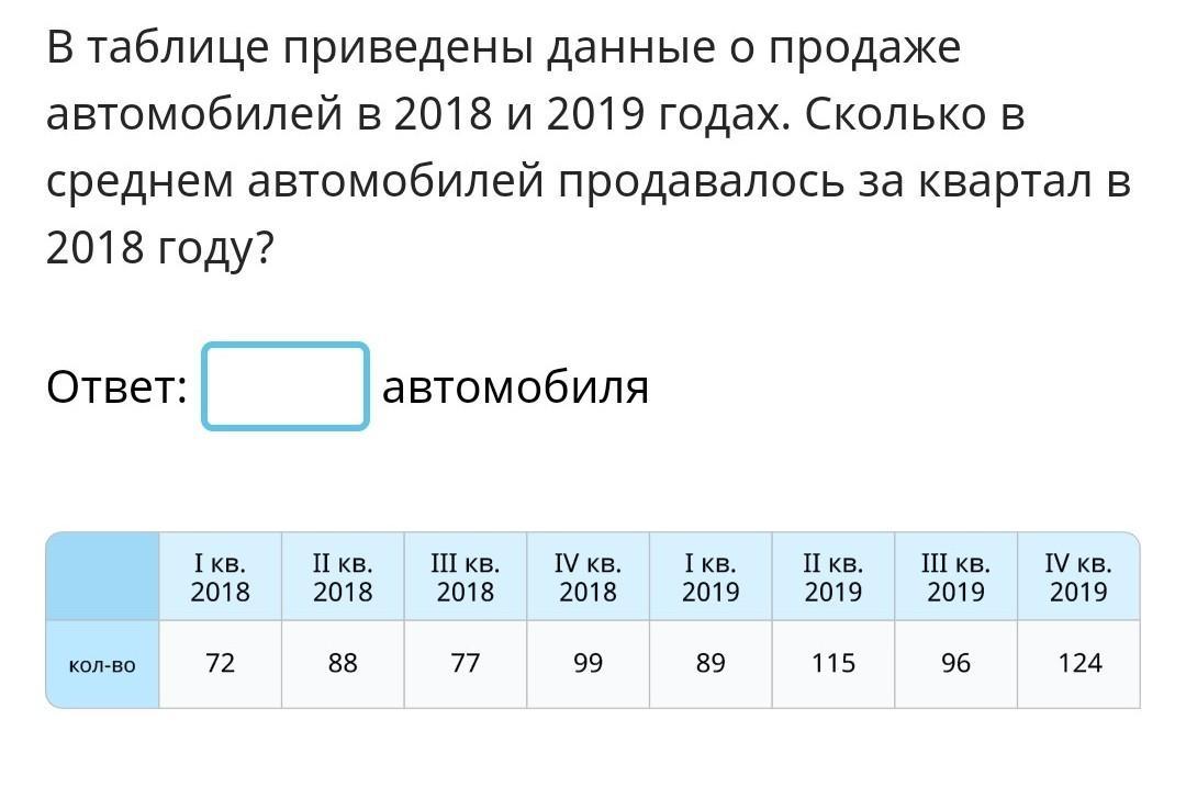 В таблице приведены данные о продаже автомобилей в 2018 и 2019 годах. Сколько в среднем автомобилей продавалось за квартал в 2018 году?
