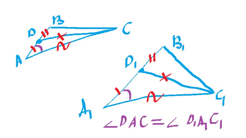 из равенства треугольников ADC и A1D1C1 следует, что AC=A1C1 и угол