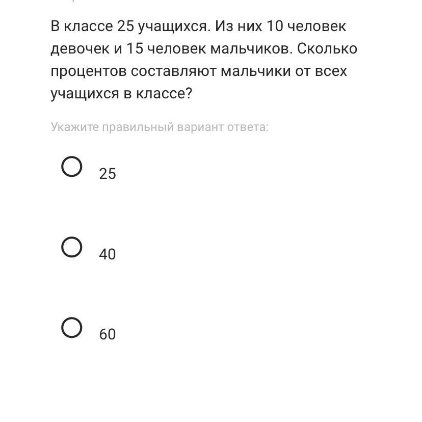В классе 25 учащихся из из них 10 человек мальчиков и 15 девочек сколько % сост мальчики