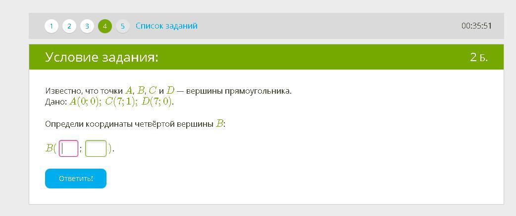 В=0;1 т к А=0;0 C=7;1 D=7;0, получается, что В=0;1(0-абцисса, а 1-ордината)