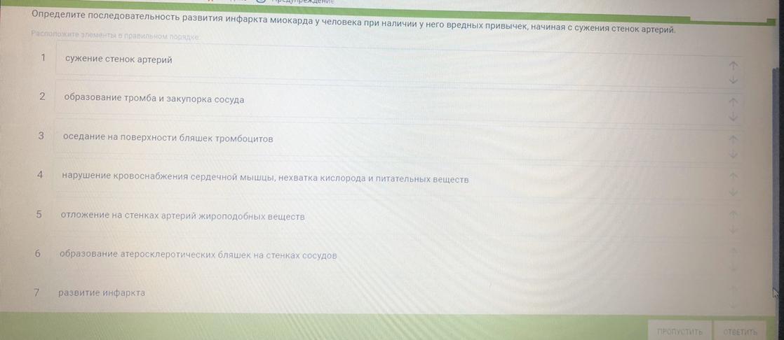 определите последовательность развития инфаркта миокарда у человека при наличии у него привычек, начиная с сужения стенок артерий
