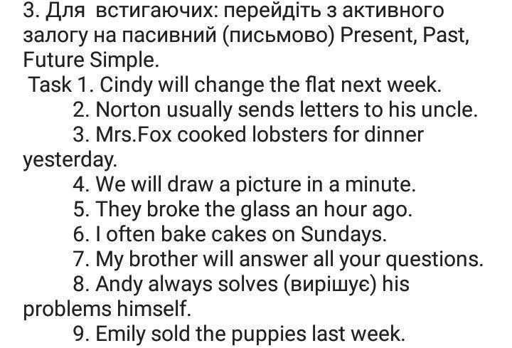 3. Lobsters were cooked by Mrs. Fox for dinner yesterday.