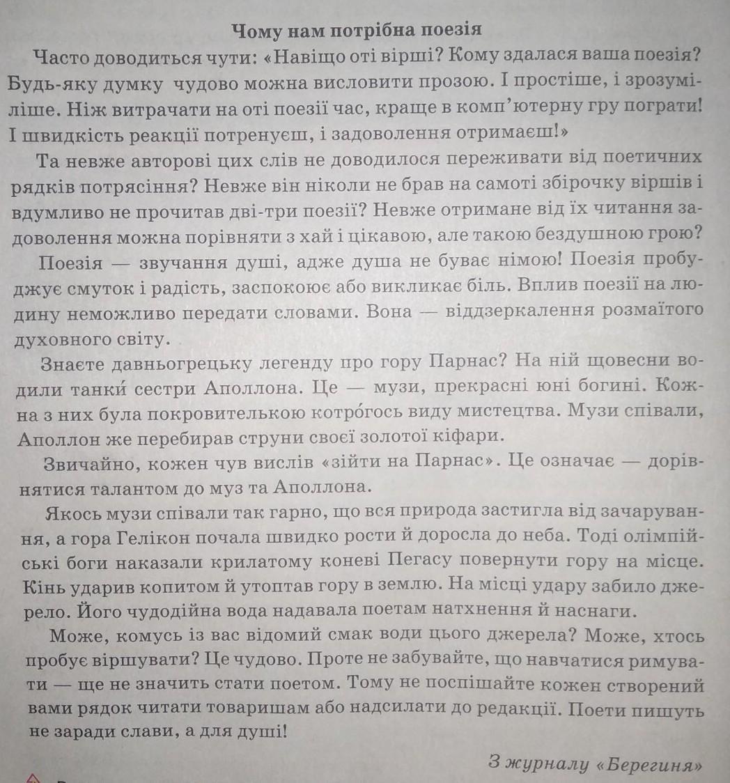 У сучасному світі часто доводидтся чути : " Навіщо нам вчити оті вірші ? Навіщо нам читати поезії та твори ? Набагато легче поспілкуватися з друзьями , або пограти на комп'ютері ніж читати та вчити вірші . " Але невже ви ніколи не захоплювалися книгою ? Невже вас ніколи не змушувалала замислюватися книга , яка розгортала перед вами цілу історію ? Невже книга у якій є частинка душі людини , можно проівняти з бездушною грою ? Поезія - це звучання душі , яка так і рвется в навколишній світ . Вона як зеркало яке показує душу . Якось ......................... й наснаги . Може комусь із вас відомий смак води цього джерела ? Може хтось вкладає душу у свої вірші ? Про те не забувайте , навчитися пистати - ще не стати поетом . Якщо ви пишете вірші , пишіть їх не заради слави , а для душі .