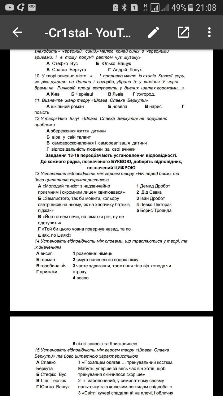 Помогите Срочно Дам 15 Балов. Давати відповідь тільки на 13,14,16 питання, 13,14 питання стосуються твору Олександра Довженка "Ніч перед боєм", 16 питання стосуються твору Ніна Бічуя "Шпага Славка Беркути".