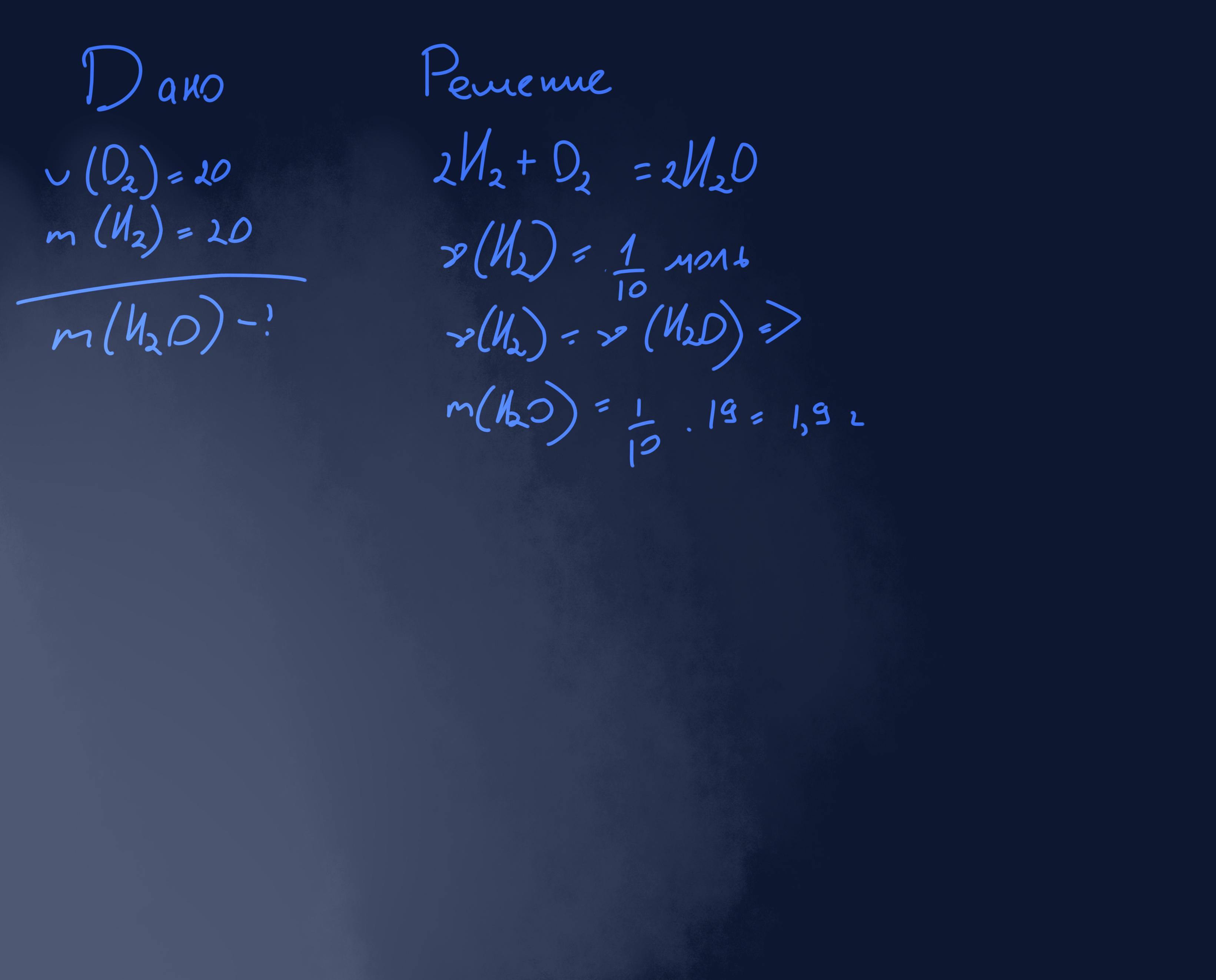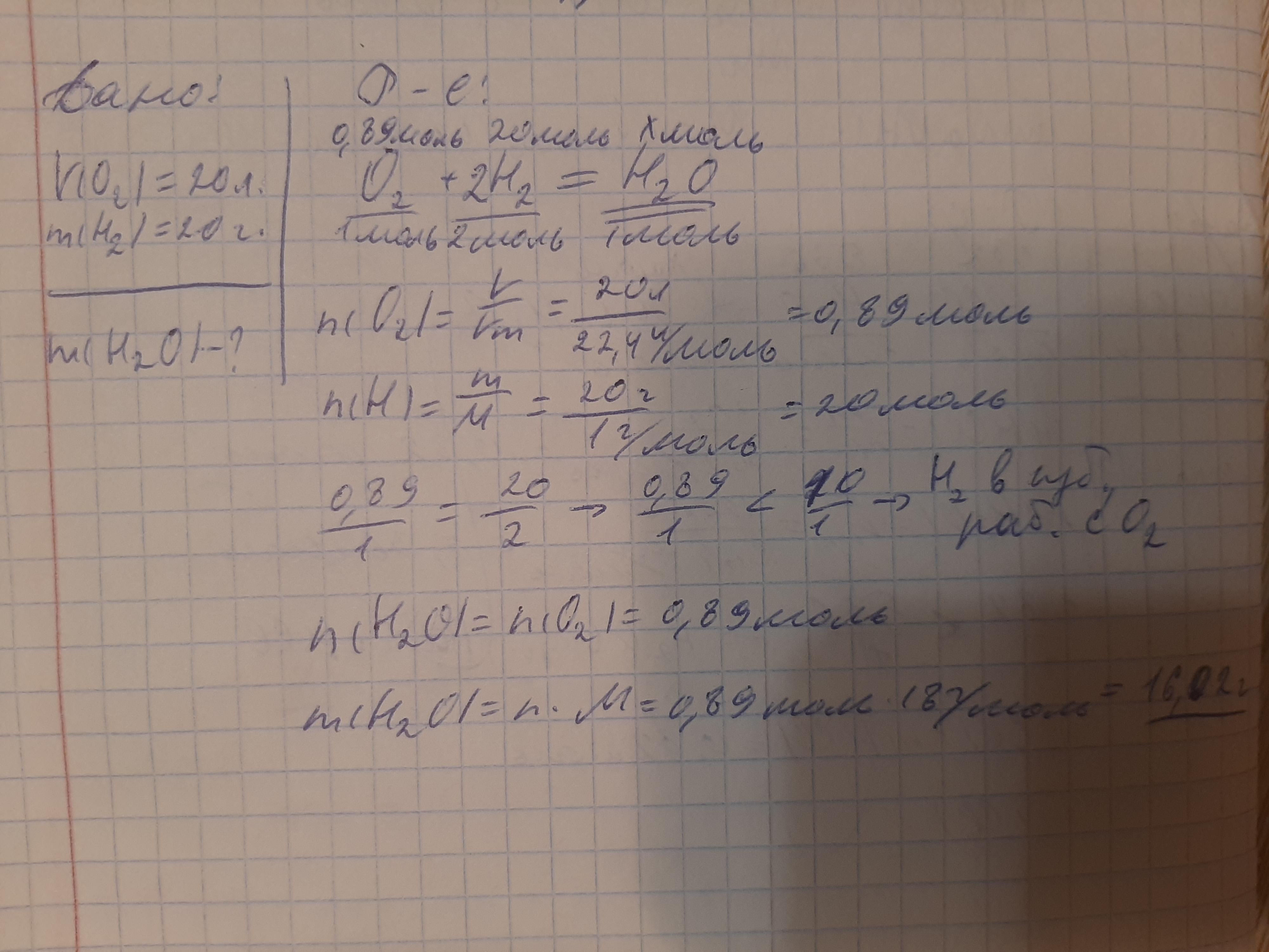 Какая масса воды получится в результате реакции соединения 20 литров кислорода и 20 граммов водорода ?