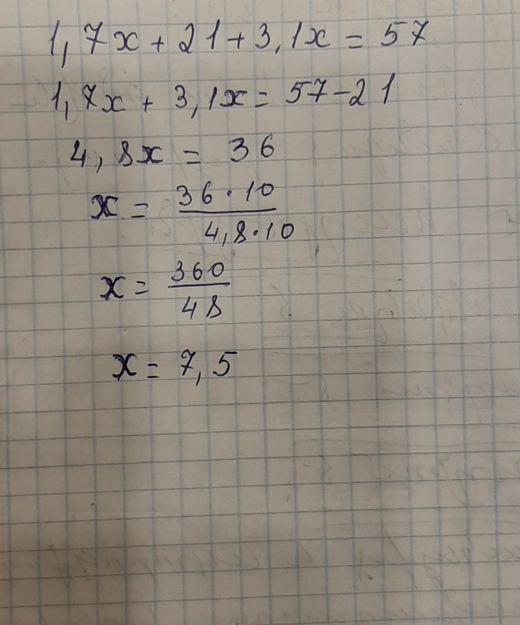 1,7x + 21 + 3,1x=57