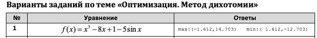 Напишите программу в питоне, которая находит все минимумы и максимумы функции на отрезке [-5;5] с точностью 0,001, используя метод «золотого сечения». Границы интервала для поиска каждого минимума и максимума задаются вручную. Определите координаты точек максимума и минимума заданной вам функции на этом отрезке.