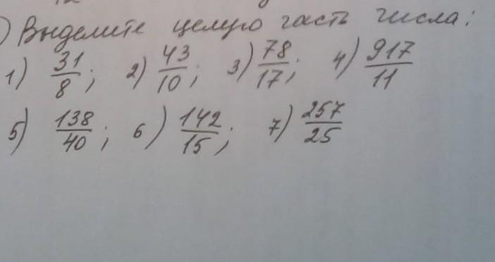 1)31:8=3 2)43:10=4 3)78:17=4 4)917:11=83 5)138:40=3 6)142:15=9 7)257:25=10
