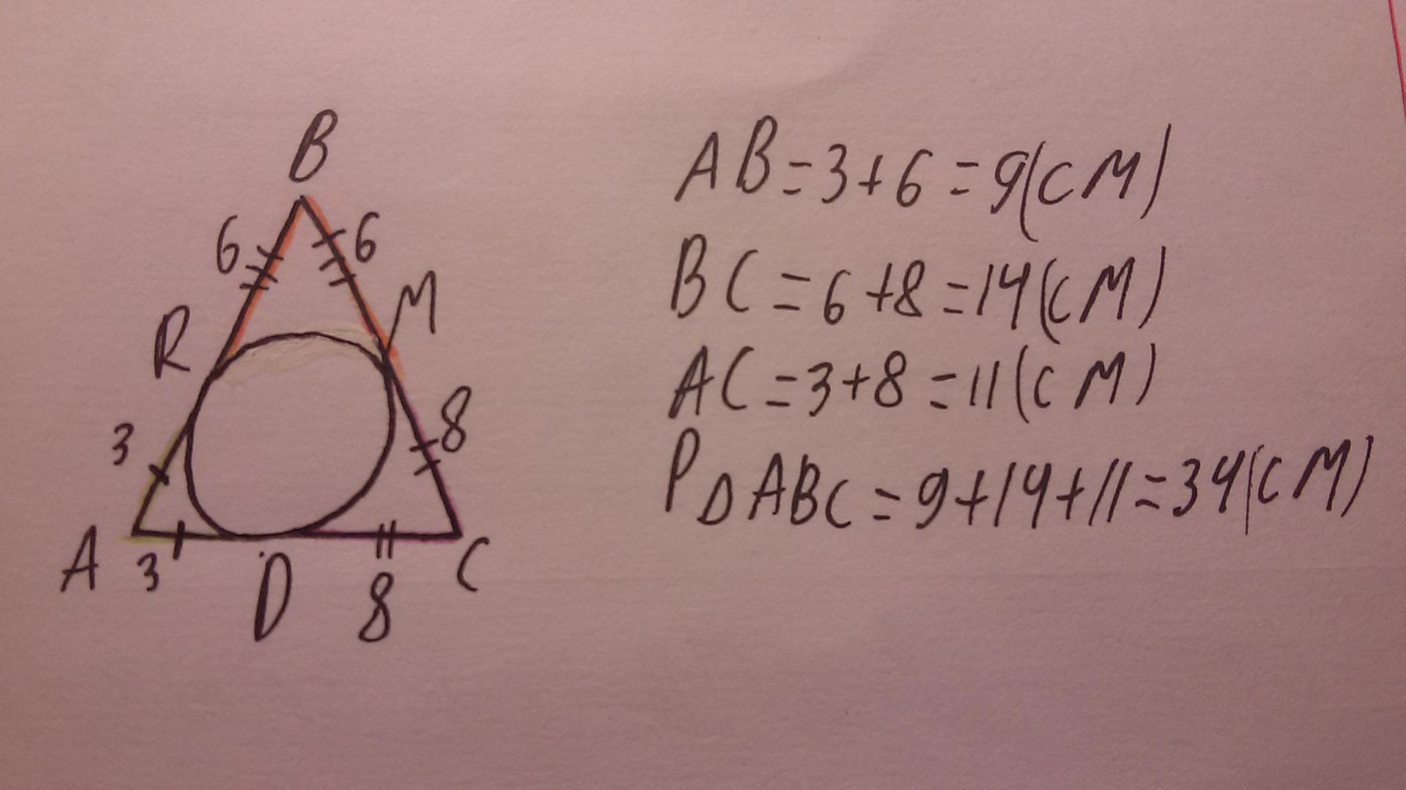 У трикутник вписано коло. Точки дотику ділять його сторони на відрізки, три з яких дорівнюють 3см, 6см і 8 см. Знайдіть периметр трикутника.