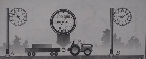 № 3. Трактор перевозит груз по горизонтальному пути из пункта А в пункт В, прилагая к нему силу. Время прохождения трактора через эти пункты указано на рисунке. Расстояние между пунктами А и В равно 150 м. Движение равномерное.