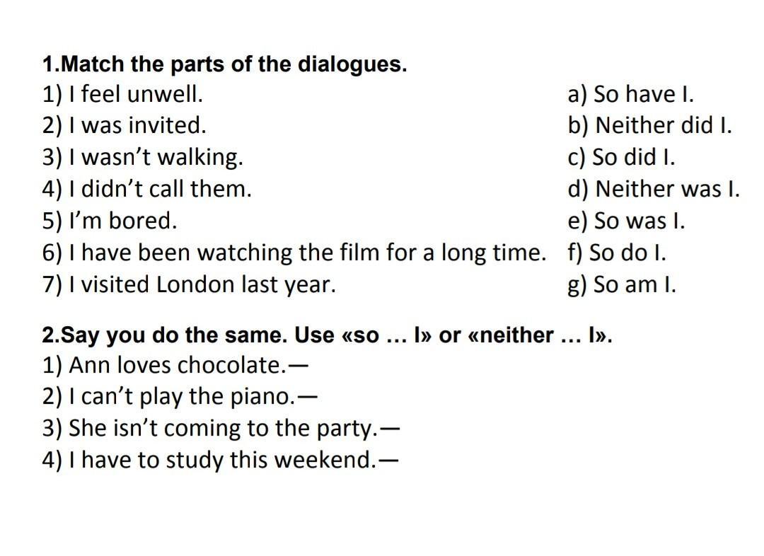 1.f 2.e 3.d 4.b 5.g 6.a 7. c Задание 2 So do I, Neither do I, Neither am I, So do I