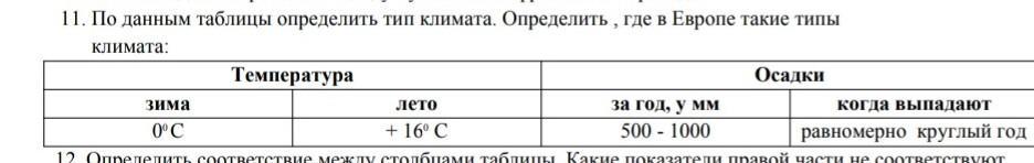 По данным таблицы определить тип климата. Определить , где в Европе такие типы климата.