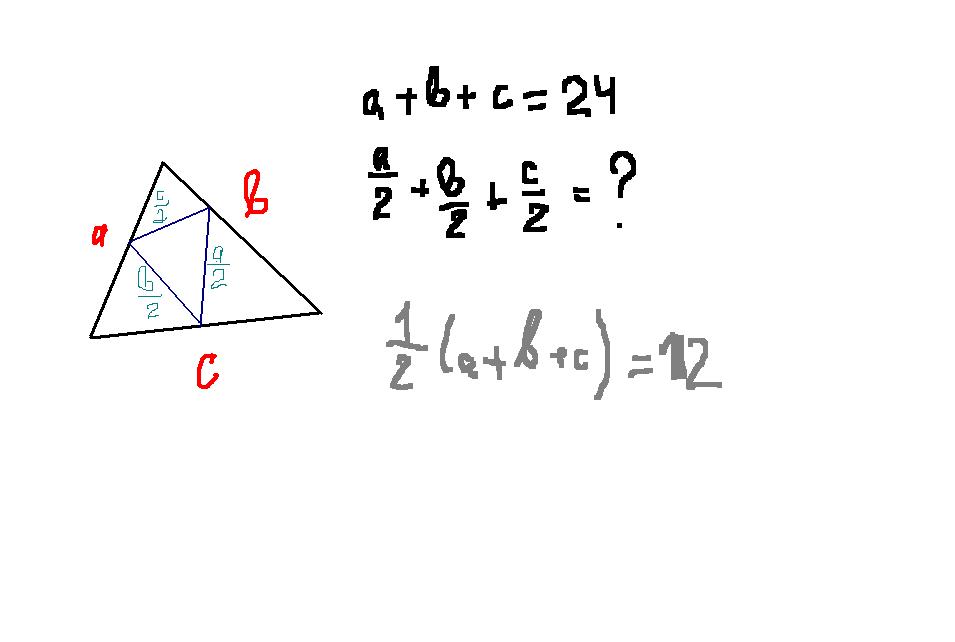 Периметр треугольника равен 24 м. Вычислите периметр треугольника , образованного средними линиями данного треугольника.