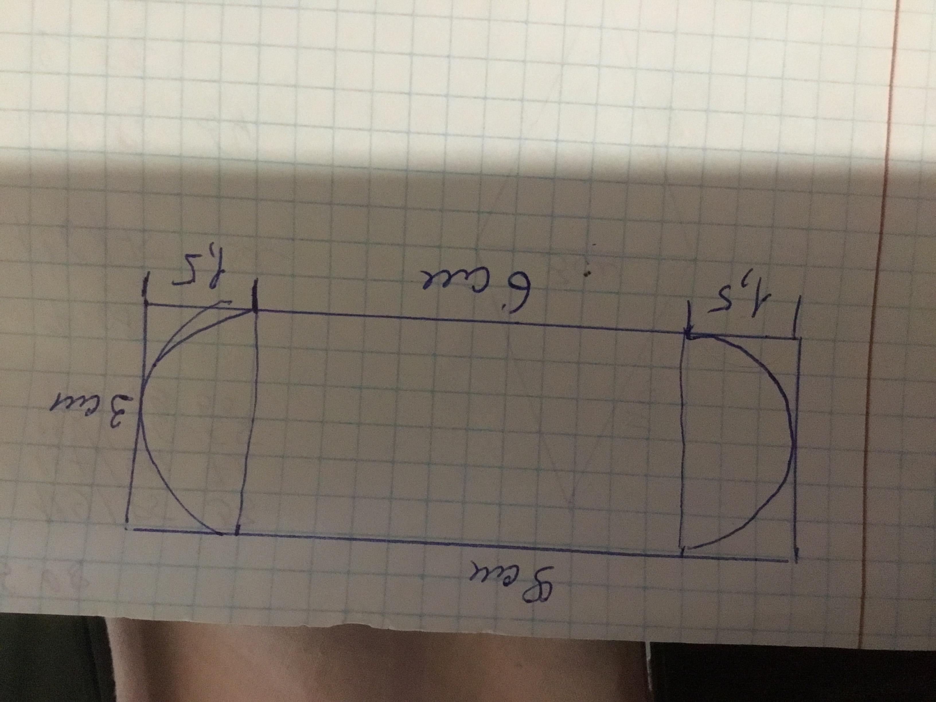 Две полуокружности дают полный круг с диаметром 3 см. полуокружность начинается по длинной стороне на расстоянии 1,5 см. то есть делим фигуру на три части, прямоугольник со сторонами 6 см и 3 см. и две полуокружности. Прямоугольник вычисляем по формуле