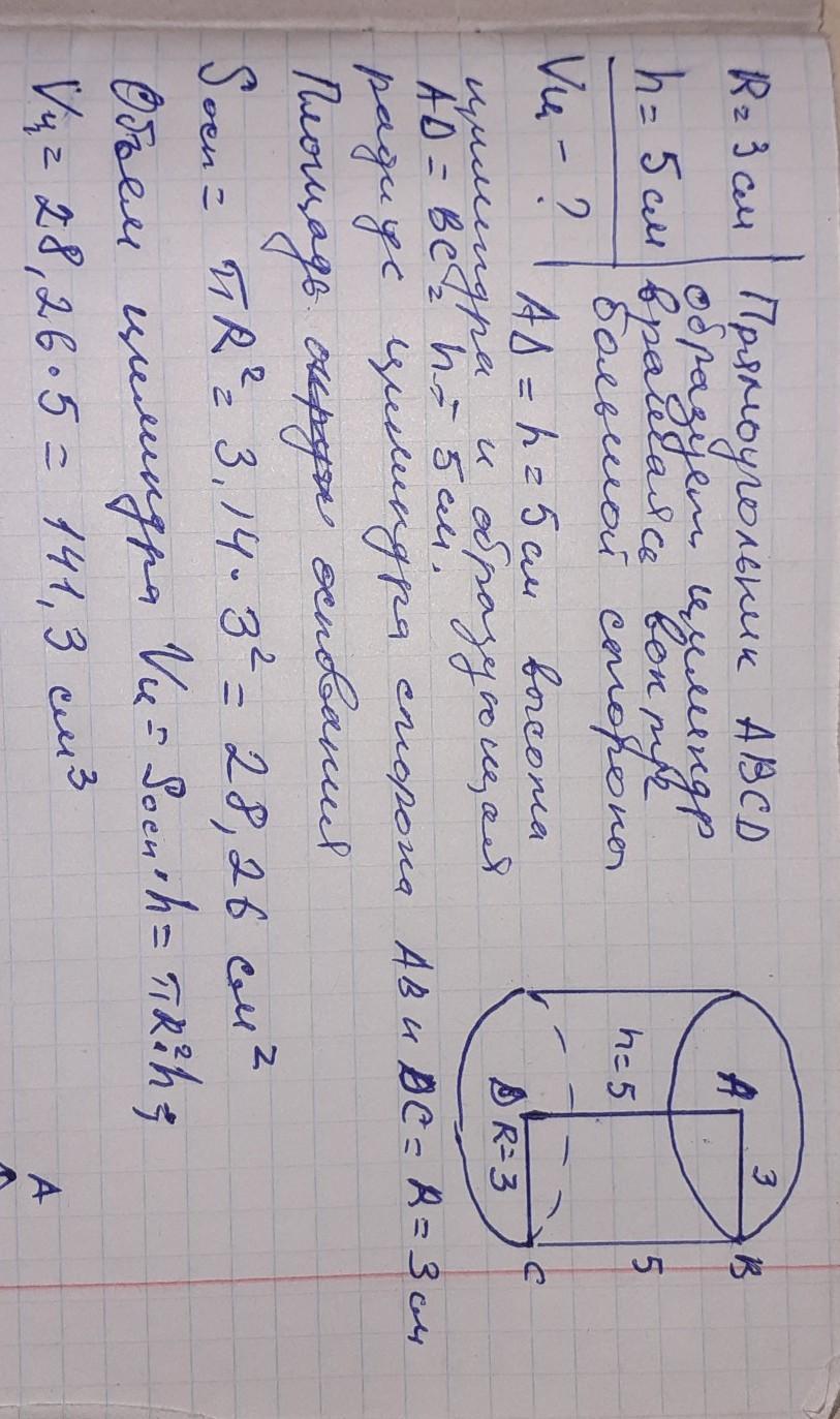 Найти объем цилиндра, который образуется вращениями прямоугольника со сторонами 3 см и 5 см вокруг большей стороны.