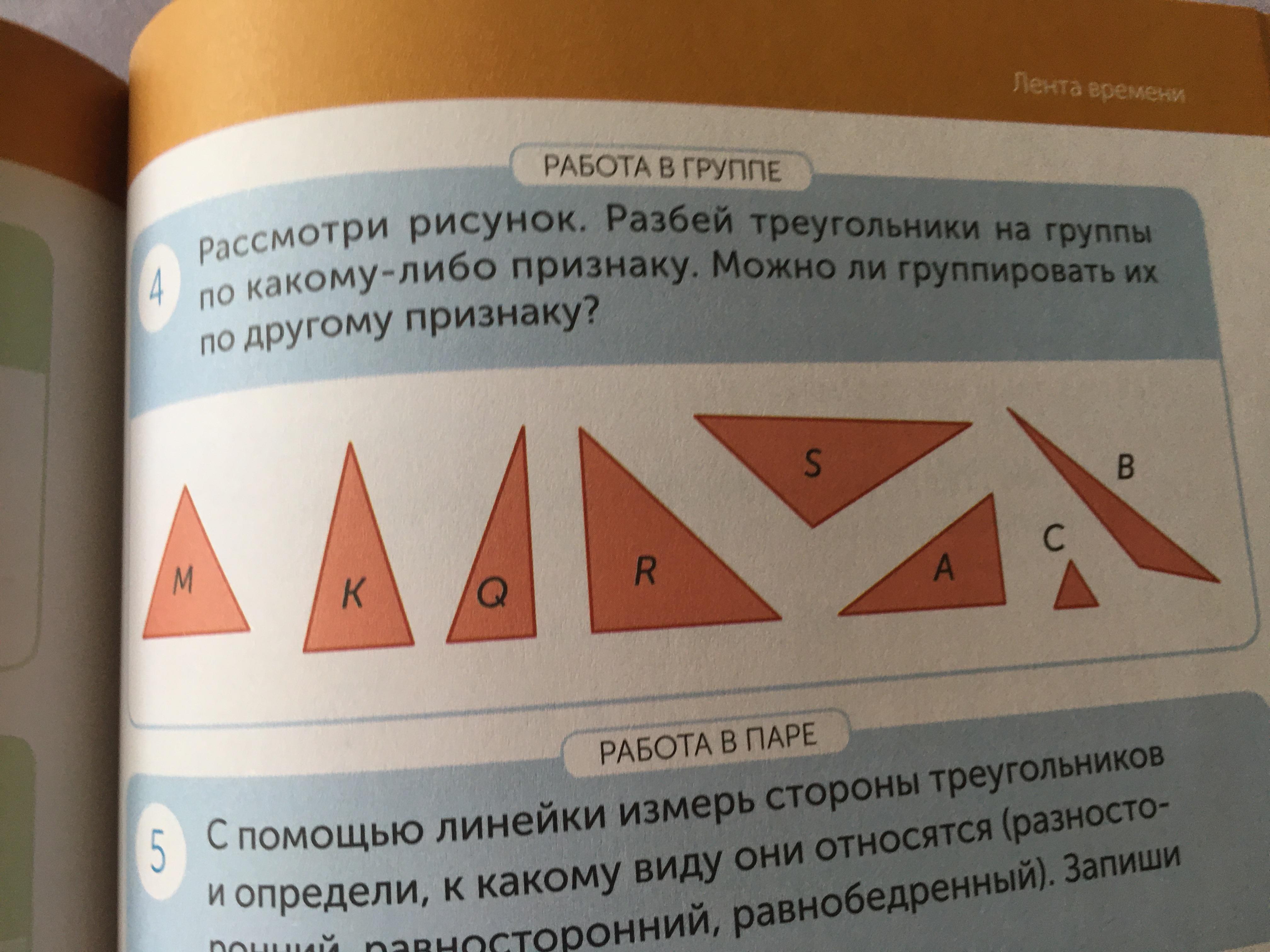 Рассмотри рисунок.Разбей треугольники на группы по какому ли признаку.Можно ли группировать их по другому признаку?