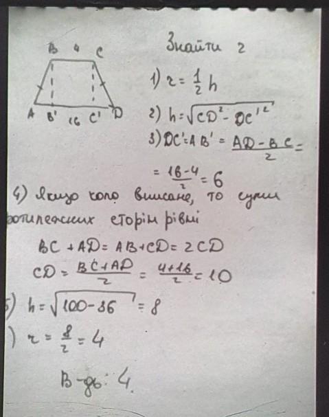 Основания равнобедренной трапеции равны 16 см и 4 см. Вычисли радиус окружности, вписанной в трапецию.