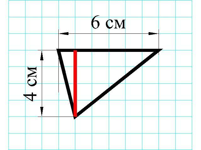 Один катет = 6 см, а перпендикуляр (красная линия) = 4 см