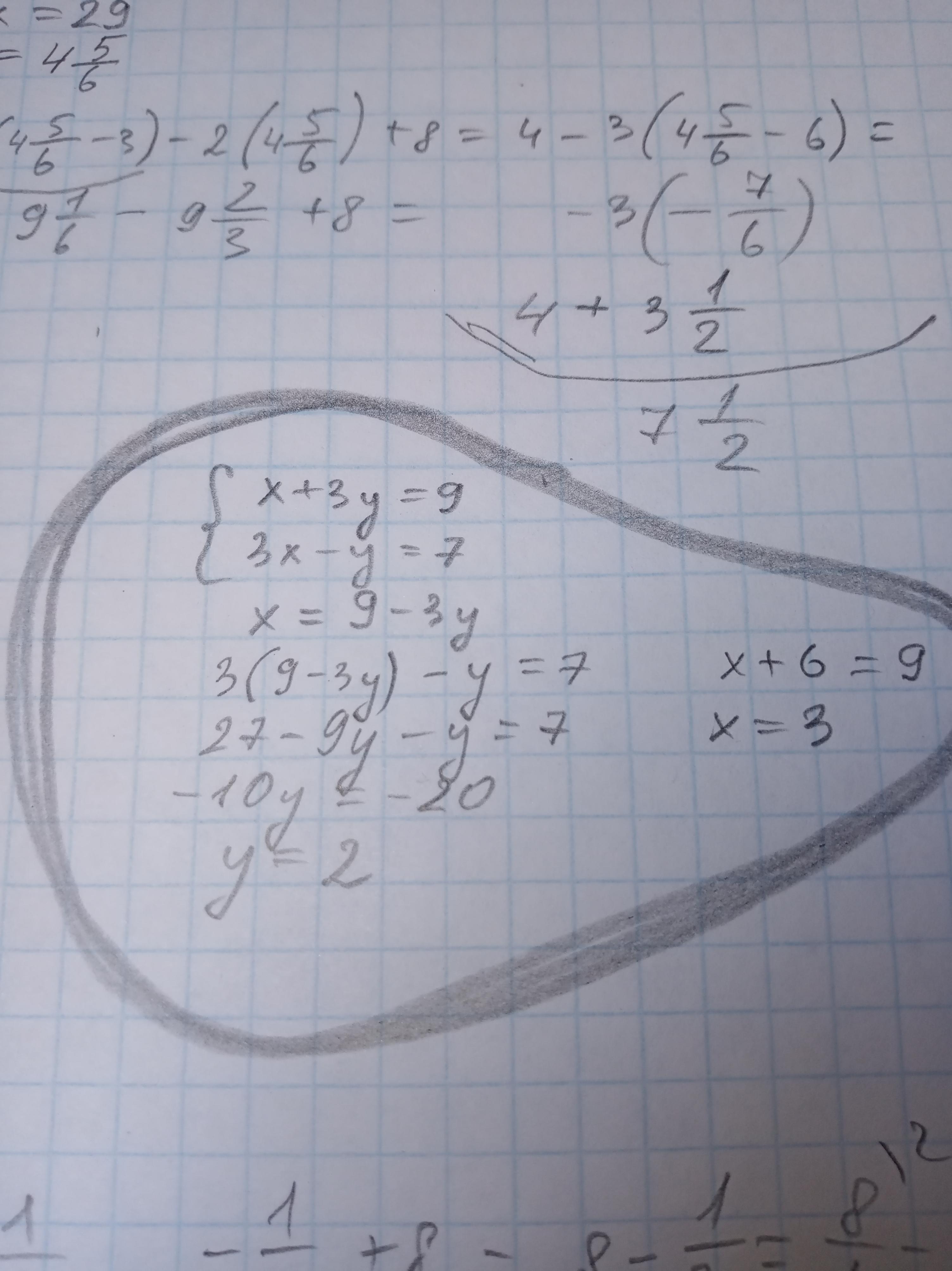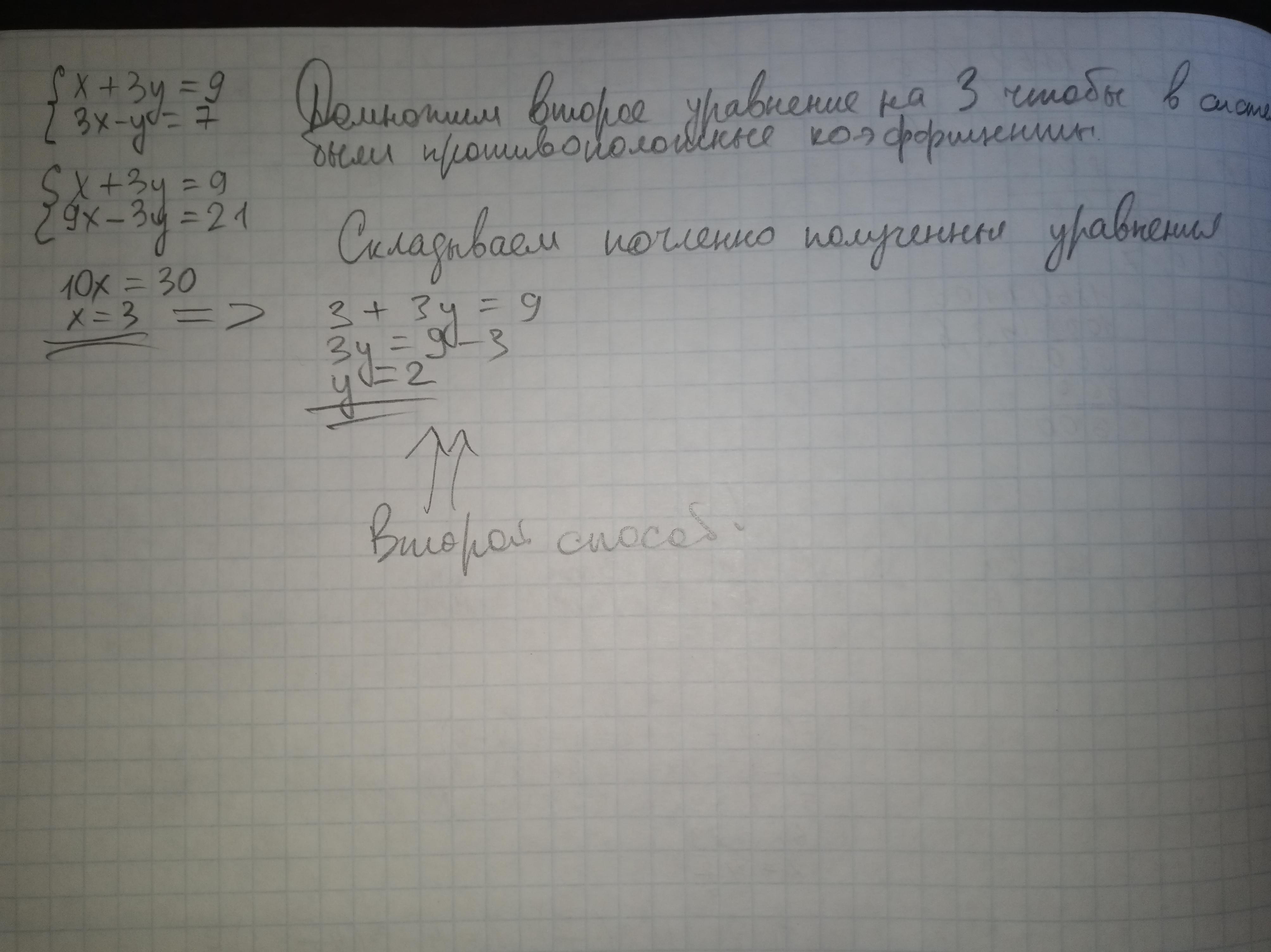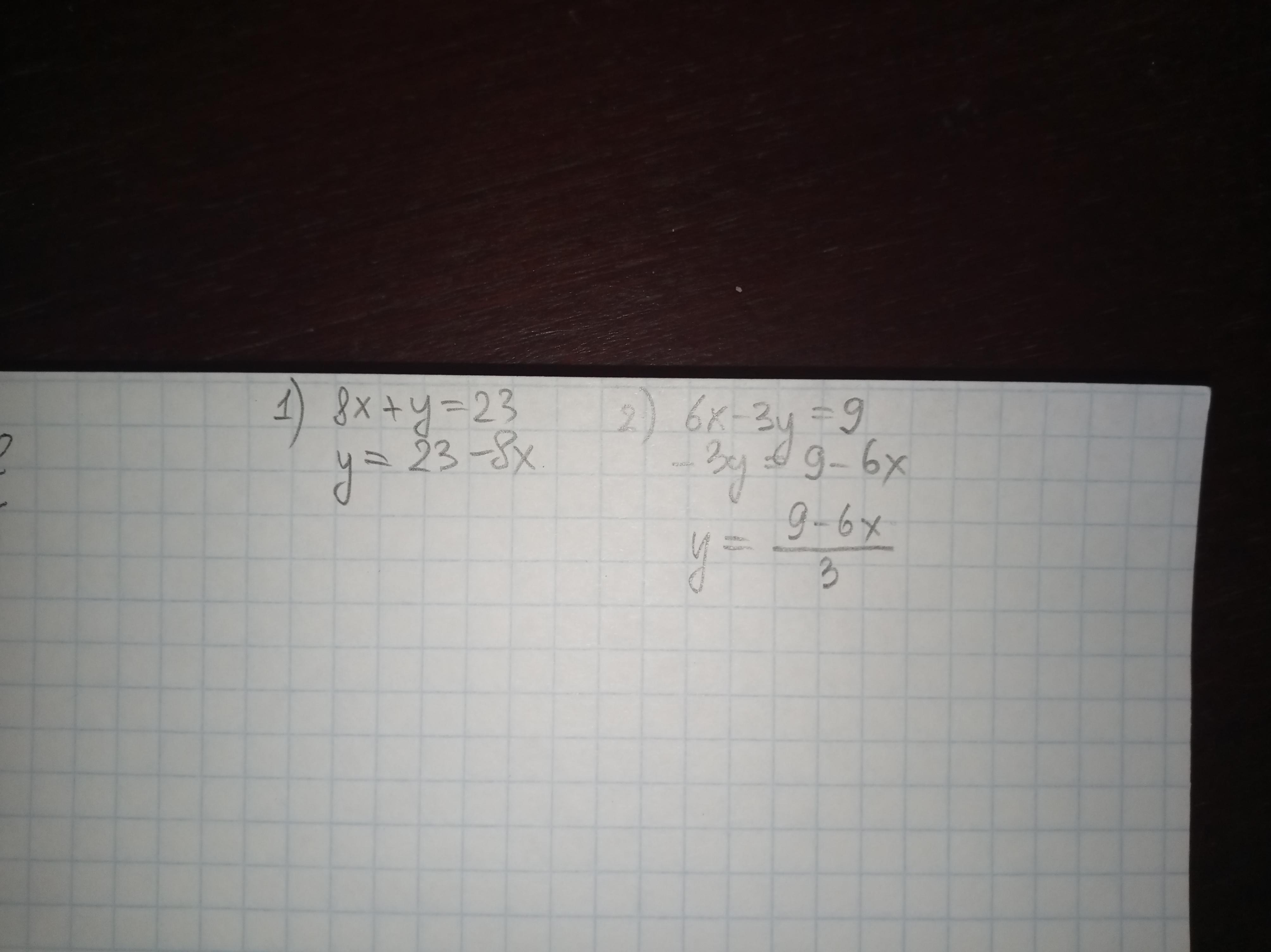 Выразите в уравнении одну переменную через другую: 1) 8х+у=23 2) 6х-3у=9. Решить систему уравнений двумя способами.