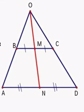 А с чего вы взяли, что они пропорциональны? Или прямая проходит через середину трапеции и основание только если стороны пропорциональны?