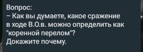 Сражение за Сталинград тоесть Битва за Сталинград. Потомучто это стало переломным моментом и точкой невозврата Вермахта после этого поражения Вермахт уже не мог планировать масштабные атаки они могли только отступать и контратаковать. Также после этого сражение ща Сталинград в Вермазте тоесть в армии Германии прозвали браьской могиллой и это событие деморолизовало дух солдат Вермахта