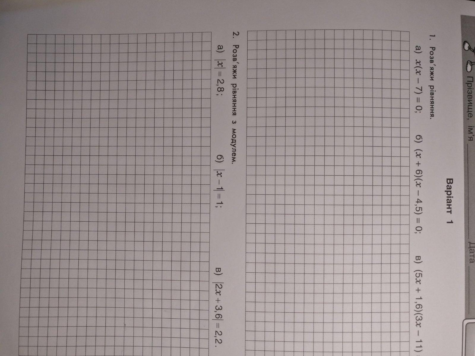 Розвяжіть рівняння 1) x(x-7) =0 2) (x+6)(x-4,5)=0 3) (5x+ 1,6)(3x-11)=0 розвяжи рівняння з модулем |x|=2,8 |x-1|=1 |2x+3,6=2,2
