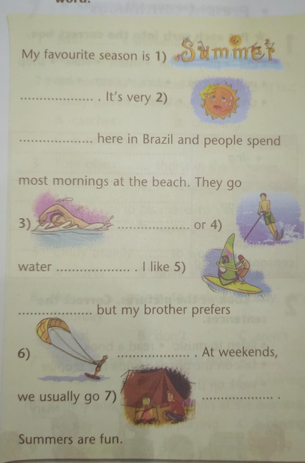 Ответ:1.Summer 2.Hot 3.Swimming 4. 5.Windsurfing 6.Kitesurfing 7.camping