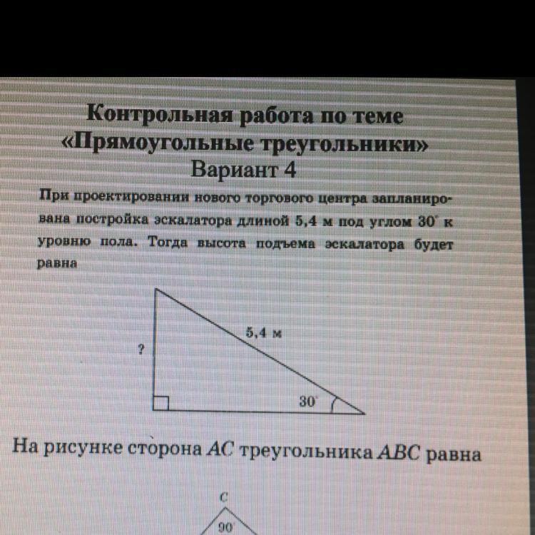 В прямоугольном треугольнике катет, лежащий напротив угла в 30 градусов равен половине гипотенузы. 5,4 м:2= 2,7 м