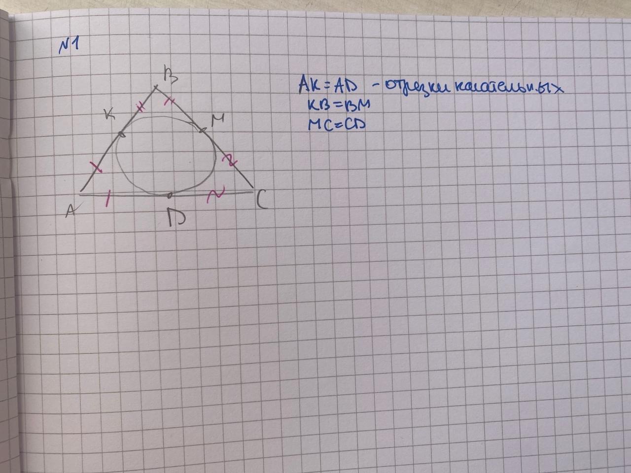 1. В треугольник АВС вписана окружность, которая касается сторон АВ, ВС, СА в точках К, М, Д. Найти АК, КВ, ВМ, МС, СД, ДА.